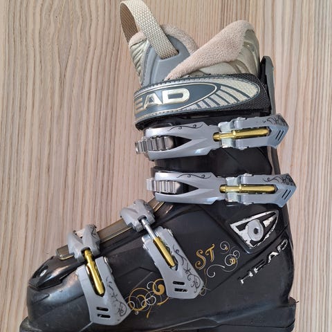 Head naisten laskettelumonot. Väri vaalea/valkoinen koristekuvioilla. Monossa neljä säädettävää solkea ja tarrakiristys varressa. Sopivat alppihiihtoon rinteessä. Kengänpohjassa standardi alppisiteisiin sopiva pohjalevy ja vaihdettavat kantapalat.