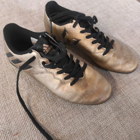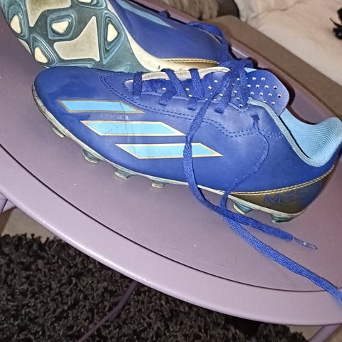 Ruoho- sekä tekonurmikentille soveltuvat nappikset koossa 35. Yhden treenikauden pelattu sisältä ehjät ja ulkopinnaltaan hyvät. Yksi selkeä jälki turkoosissa raidassa oikean kengän kärjen sisäreunassa. Pohjissa pinttymiä.