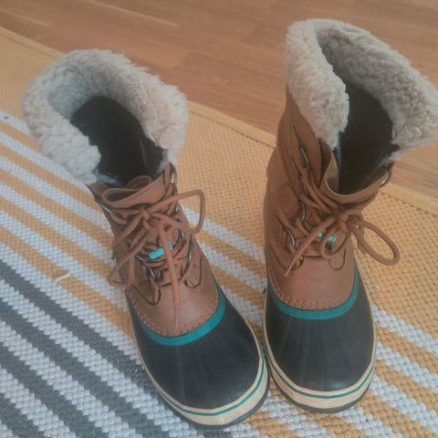 Uuden veroiset lämpimät, huopaisella sisäkengällä varustetut Sorel talvikengät. Vettä pitävät. Muutaman kerran olen pitänyt ja liian suuriksi totesin. Vastaa hyvin ilmoitettua kokoa. Lestikin melko reilu. Joutaa kaapista uusiin seikkailuihin.