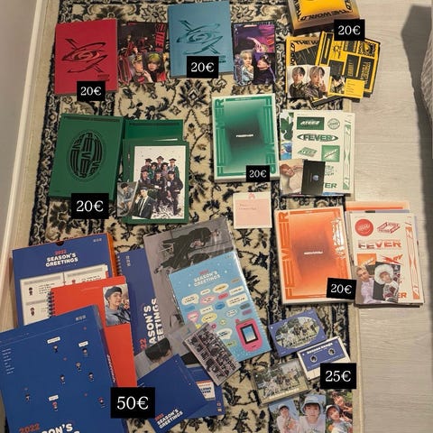 Myyn kuvassa näkyvät Ateez-albumit ^^ Kaikki ovat enimmäkseen hyvässä kunnossa, vain parissa albumissa on pieniä jälkiä (katso kuvat 3-5). Toistaiseksi myyn vain settinä! Toisessa kuvassa näet albumien mukana tulevan sisällön, lisäsin mukaan myös joitain poca-albumien juttuja joita kotoa löysin :) Albumit sisältää totta kai myös photobookit ja cd-levyt!