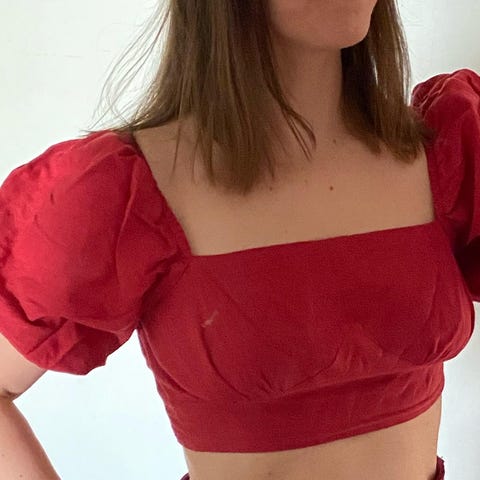Valkoinen kapeavyötäröinen paita, jossa mustia raitoja sekä lurexia (hopeanväristä kimaltavaa lankaa). 3/4 pituiset hihat. Edessä lyhyt napitus. Paidan erikoisuus on toisella sivulla oleva pitkä vetoketju, joka auttaa päällepukemisessa ja tekee vyötäröstä napakan.