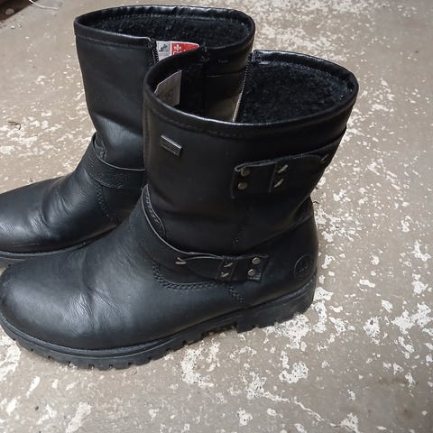 Rieker saappaat, koko 40. Väri musta. Polven alapuolelle ulottuva varsi, jossa sivuvetoketju pukemisen helpottamiseksi. Korokepohja ja kuminen, kuvioitu ulkopohja antavat pitoa. Varren ympärillä koristehihnat ja ketjudetaljit. Korko 4 cm. Hyvät pohjat. Vähäisiä käytön jälkiä.