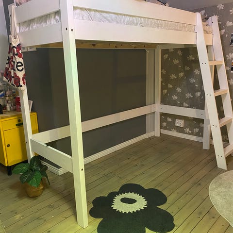 Valkoiseksi maalattu Ikean parvisänky. Muutamia tarroja, ei yritetty poistaa. Nyt osina.