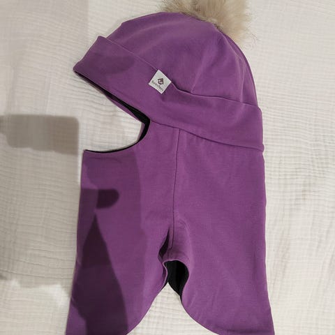 Kivat lasten kypärämyssy, koko 122, noin 6-10 v lapsen pään koosta riippuen. Materiaali villaa. Väri vaaleanpunainen, timanttikuvioitu pinta ja tupsut. Peittää pään, kaulan ja osan ylävartalosta. Vuorissa vaalea kangas, joka on pehmeä ihoa vasten. Korvien kohdalla paksumpi täyte.