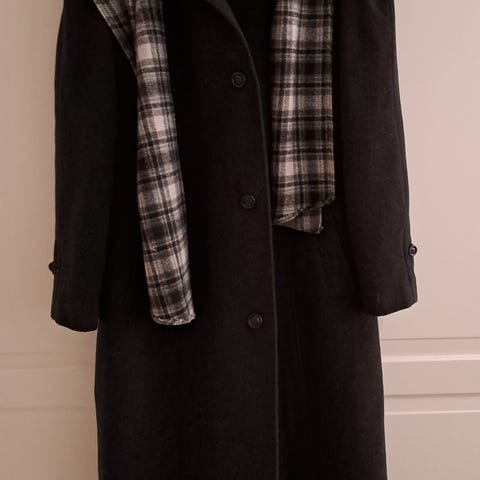 Ajaton musta malli, jossa kauniit isot napit ja kevyt kiilto kankaassa.
