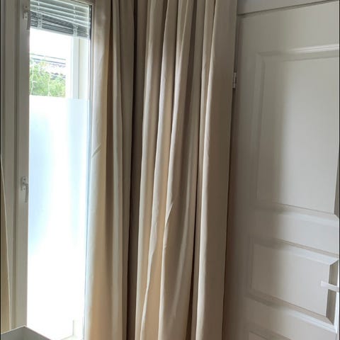 Myydään kaksi kappaletta pimentäviä verhoja. Yhden tuotteen koko on leveys 135cm ja korkeus 241 cm. Alhaalla ommeltu painot niin laskeutuvat kauniisti.