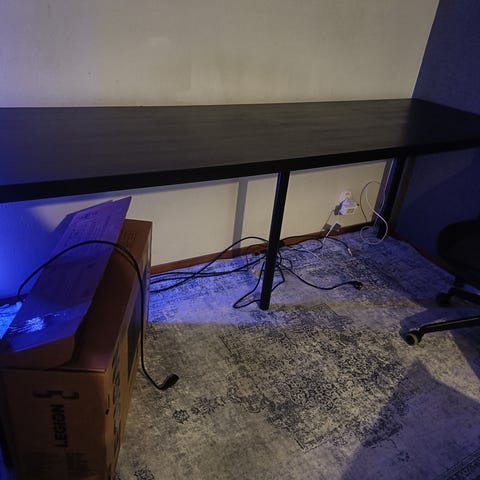 Tukeva työpöytä. Pöytälevyn leveys 140cm, syvyys 60cm. Korkeuden voi säätää, mutta ei ole kampi eikä sähkösäätöinen.