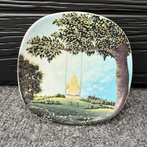 Arabia Kesätunnelmia Sommar seinälautanen. Lautasessa on kesäaiheinen kuvitus, jossa lapsi istuu keinussa puun alla. Takapuolella on tekstit "Kesätunnelmia", "Sommar", "Summer atmosphere" ja "Sommerstimmung" sekä suunnittelijan nimi. Lautanen on posliinia ja siinä on ripustusreikä tai -kohta seinälle kiinnittämistä varten. Myydään alkuperäisessä laatikossa, jossa on tilaa omille merkinnöille.