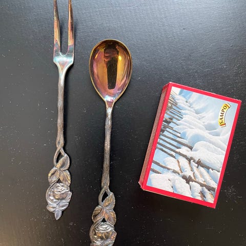 Leima leijona (= Kultakeskus Oy) kruunu 813H Hämeenlinna C7 (= vuosi 1956). Kaiverrus Seppo. Lusikan pituus 11,7 cm. Alkuperäislaatikko kuuluu kauppaan.