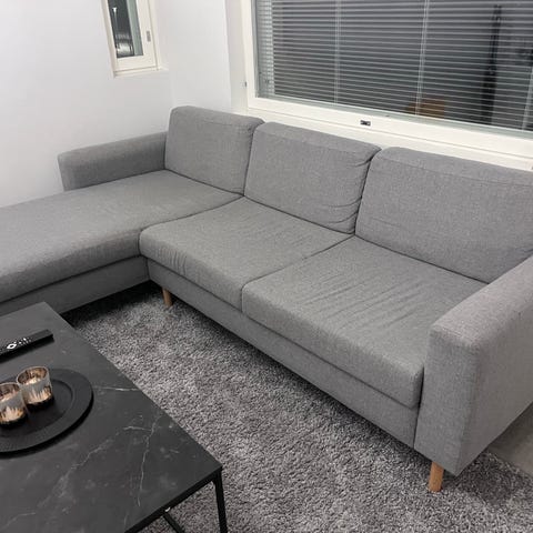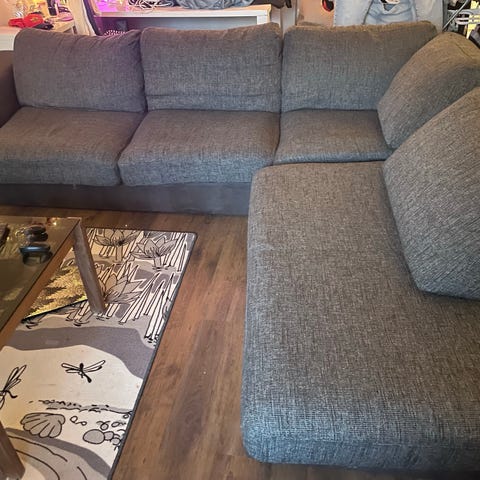 Vaalean harmaa ihana jätti sohva jossa mahtuu kaksi ihmistä ja pari koiraa nukkumaankin oikein hyvin. Rahin puolella divaaniosassa joku lika läikkä, ei ole yritetty sen enempää pestä. Meillä viltit sohvan päällä. Mukana koiran ja kissan karvoja varmasti ja se saa ihan kaupan päälle.
