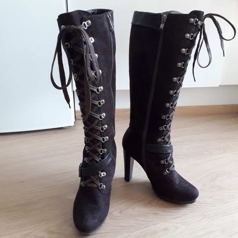 Koko noin 37-38 (saappaissa merkintä 7). Pohjan sisäpituus noin 24,5- 25cm. Varren pituus kantapäästä ylös 37cm. Koron korkeus 6,5cm. Varren ympärys reunasta litteänä mitattuna 18-18,5cm.
