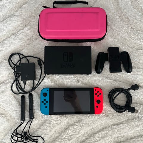 Nintendo Switch -pelikonsoli neon punaisilla ja sinisillä Joy-Con-ohjaimilla. Mukana telakka, Joy-Con-ohjaimet ja kaapeleita kuvien mukaisesti. Konsolia voi käyttää sekä kannettavana käsikonsolina että telakan kautta televisioon liitettynä. Soveltuu monenlaiseen pelaamiseen yhdelle tai useammalle pelaajalle Joy-Con-ohjaimia hyödyntäen.