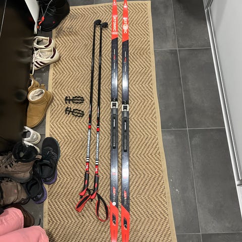 Atomic 140 perinteisen sukset ja Rex hiihtosauvat 110 cm ja Salomon Team monot koko 34.