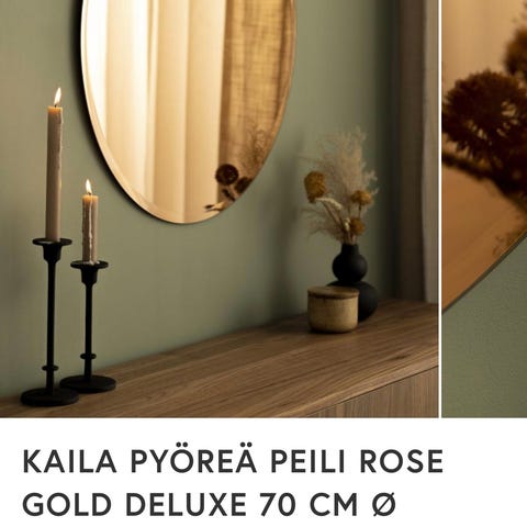 Upea iso pyöreä peili, metrin halkaisija. Pari naarmua, ei kovin huomattavia eikä haittaa käyttöä. Savuton ja eläimetön koti. Haku Raksilasta.
