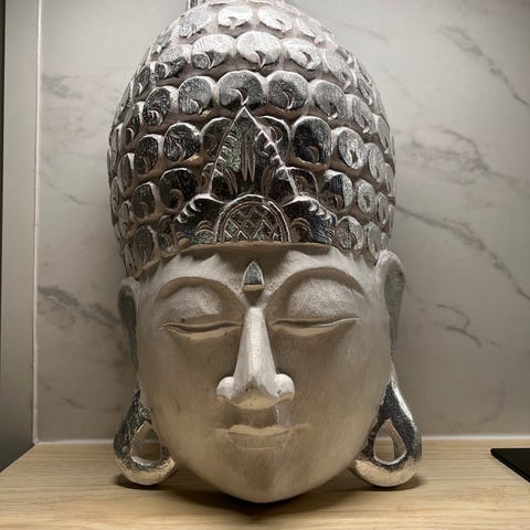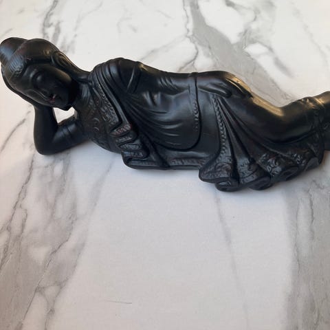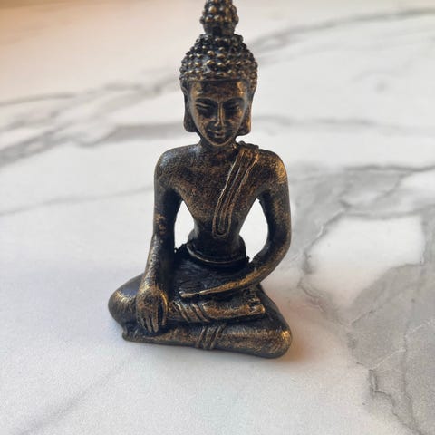Indiska koristepatsas, jossa istuva buddha-hahmo. Väriltään vaaleanvihreä ja pinnaltaan kiiltävä. Patsas sopii sisustuselementiksi esimerkiksi hyllylle, ikkunalaudalle tai pöydälle. Materiaali vaikuttaa olevan kovaa, lasitettua materiaalia (esim. keramiikka tai vastaava).