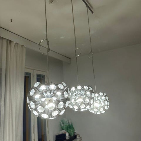 Kolmilamppuinen kromattu riippuvalaisin, jossa on valkoiset lasikuvut. Sopii hyvin esim. Ruokapöydän päälle. Hyväkuntoinen ja toimiva, juuri käytöstä irroitettu.