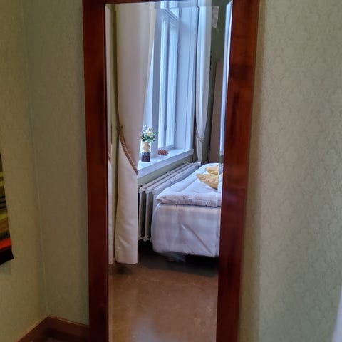 Empiretyylinen, puinen peilin kehys. Koko noin 50x90. Vanha, suurella todennäköisyydellä 1800-luvulta Ruotsista. Kunto vastaa ikää: on jämäkkä ja tukeva mutta nähnyt elämää (ks kuvat). Peiliä tässä ei siis ole, mutta on joskus ollut kuten reunan kiinnitysnauloista voi päätellä. Esimerkiksi Bukowskilla ja Stockholms auktionsverketillä näitä myyty hintaan 100-300€.