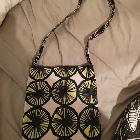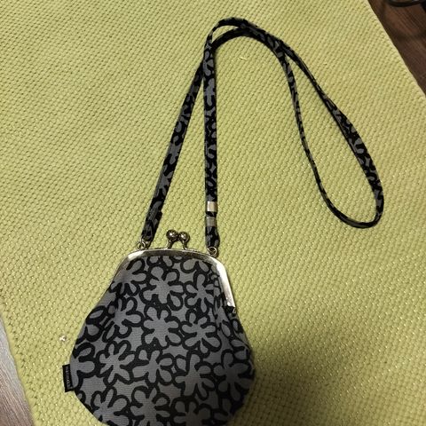Marimekko olkalaukku naisille. Laukku on valmistettu kankaasta ja sen väri on vihreä. Laukussa on lyhyehkö olkahihna, metalliset renkaat kiinnityskohdissa sekä Marimekko-logomerkki edessä. Sisäpuolella on vaalea vuori ja vetoketjullinen sisätasku pienten tavaroiden säilytykseen. Sopii arjen käyttöön esimerkiksi lompakon, puhelimen ja muiden pientarvikkeiden kuljettamiseen.