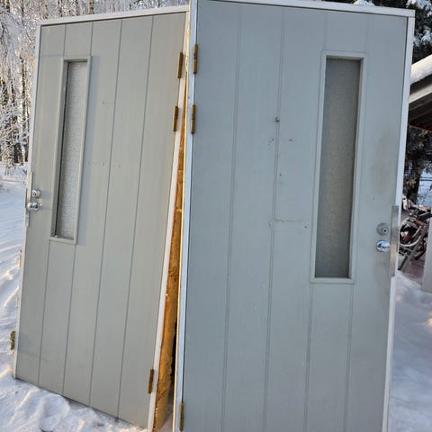 Ok kuntoinen ulko-ovi + karmit, ei kiero. Kahva ja lukkorunko mukaan. Vain nouto.