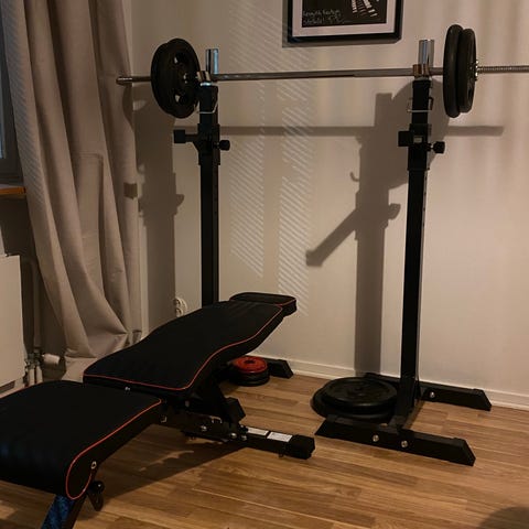 Settiin kuuluu penkki, levytanko sekä useita pyöreitä painolevyjä eri painoissa about 80kg