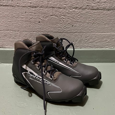 Salomon hiihtomonot maastohiihtoon. Koko EUR 43 1/3 (UK 9, USA 9,5, 27,5 cm). Väri musta, ulkopuolella vetoketjulla suojattu nauhoitus ja nilkkaa tukeva rakenne. Sopivat maastohiihtoon käyttäjälle, jonka jalkaterän pituus on noin 27,5 cm.