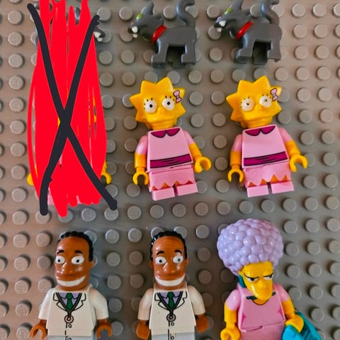 Lego The Simpsons-sarjan minifiguurit kokoelma. Useita erilaisia hahmoja, jotka on aseteltu valkoiseen kehykseen riveihin. Sopii esille laitettavaksi sisustuselementtinä. Hahmot ovat irrotettavissa ja käytettävissä tavallisten Lego-rakennelmien kanssa.