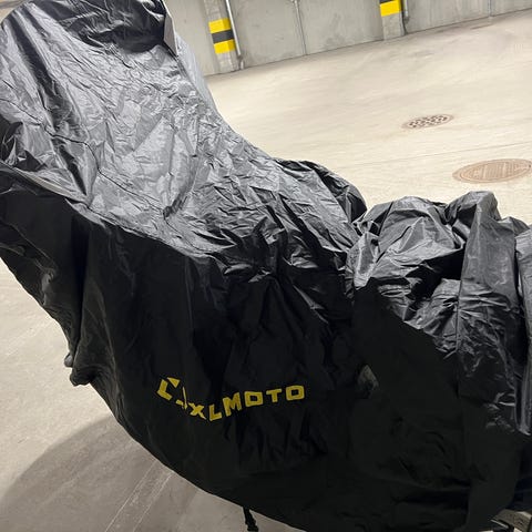 MP-ASU moottoripyörän suojapeite. Väri musta, materiaalina kevyt ja taipuisa kangas, joka soveltuu moottoripyörän suojaamiseen säilytyksen tai pysäköinnin aikana. Peite auttaa suojaamaan pyörää lialta ja säältä. Kuvissa näkyy peitteen koko ja muoto suhteessa ympäristöön.