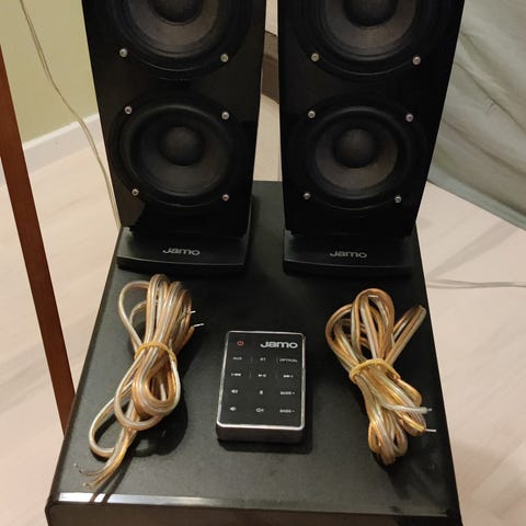 Jamo P404 -hyllykaiuttimet (2 kpl) sekä Jamo SUB 210 -subwoofer. Hyvä kokonaisuus esim. olohuoneeseen, tietokoneelle tai kotiteatteriin – selkeä ääni ja subilla mukavasti bassoa.