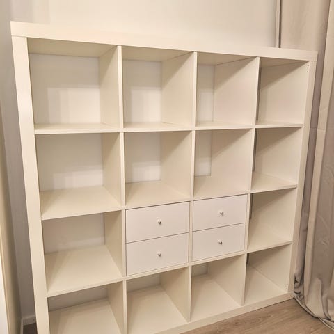 IKEA Kallax hyllykkö, väri valkoinen. Hyllykössä on useita neliönmuotoisia lokeroita, jotka soveltuvat esimerkiksi kirjojen, säilytyslaatikoiden tai koriste-esineiden säilytykseen. Rakenne on laminoitua puukuitulevyä. Sopii käytettäväksi esimerkiksi olohuoneessa, makuuhuoneessa tai työtilassa huonekaluna ja säilytysratkaisuna.