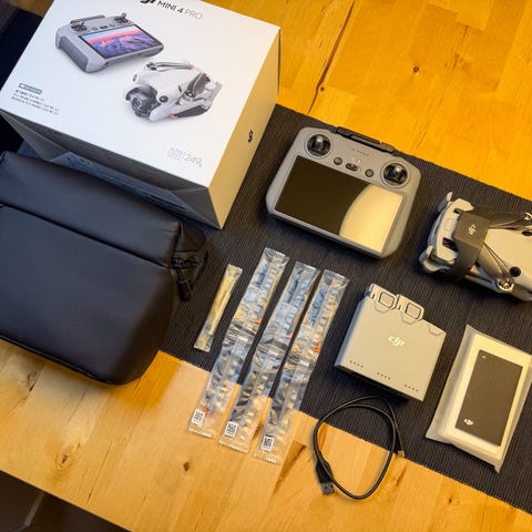 Vähäisellä käytöllä oleva DJI Mini 4 Pro -kameradrone kauko-ohjaimella. Paketissa on nelikopteri, DJI-kauko-ohjain, kaksi akkua, laturi/kaapelit sekä kantolaukku. Mukana on myös nousu-/laskeutusalusta ja kellukkeet erilliseen kiinnikkeeseen. Lisäksi potkuri paketteja. Drone on taittuvajalkainen malli, jossa on eteenpäin suunnattu kamera gimbaalilla. Soveltuu ilmakuvaukseen ja videointiin harraste- ja kuvauskäyttöön. Tarkemmat tekniset tiedot, kuten kameran resoluutio, akun kesto ja kantama, löytyvät DJI Mini 4 Pro -mallin valmistajan ohjeista.