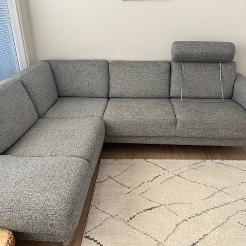 6v vanha, Maskusta ostettu avokulmasohva. Siisti yleisilme. Lyhyellä sivulla 2 kpl nousevia jalkatukia (recliner). Konjakin värinen keinonahka. Myydään muuton tieltä.
