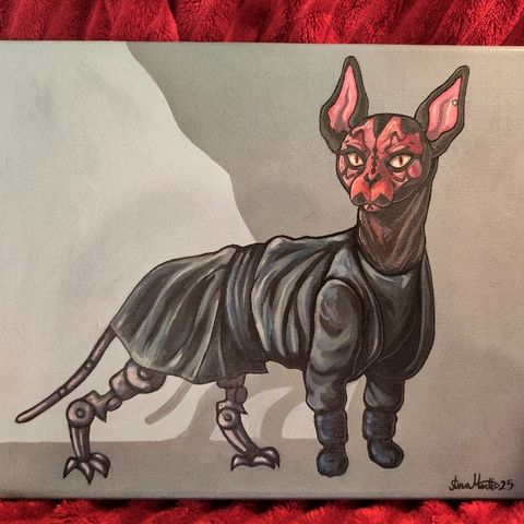 Käsintehty akryylimaalaus, jossa aiheena Darth Vader -hahmo. Maalattu pingotetulle kankaalle, johon lisätty teksturoitua pintaa. Värimaailma on pääosin mustavalkoinen, taustassa harmaan ja oranssin sävyjä.