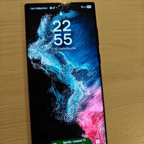 Samsung Galaxy S22 Ultra älypuhelin hopea. Puhelimessa on useampi takakamera, suuri kosketusnäyttö ja metallinen kehys. Laitteen alareunassa on USB-C-liitäntä, kaiutinritilä ja paikka S Pen -kynälle.Kunto on erinomainen ja kynä toimii . Laatikko ja kuitti löytyy takuu ei enään voimassa