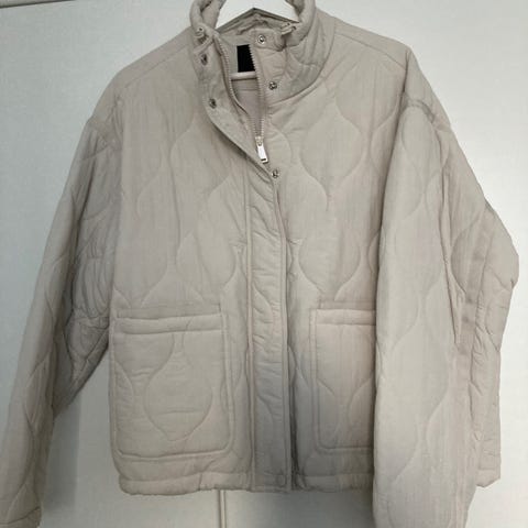 Beige naisten talvitakki, koko L. Topattu, polven yläpuolelle ulottuva malli, jossa on korkea kaulus ja etuvetoketju. Edessä taskut ja vyötäröllä kevyttä rypytystä istuvuutta varten. Sopii kylmään säähän arkikäyttöön.