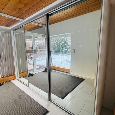 Erilliskaappi katto ja sivulevyillä, valkoiset kehykset. Viisi liukuovea (65cm leveitä), joista kolme on valkoista (huom ei maitolasi) ja kaksi lainepeiliä. Sisällä kaksi tanko-osuutta ja 3 koritornia.
