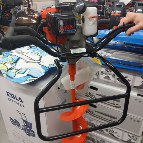 Ehjä moottorikaira. Hyvä kampe. Ei tarvi kun bensaa tankkiin ja rokkaa. Kairan halkaisija 150 mm vaihtoterät kaupan päälle.