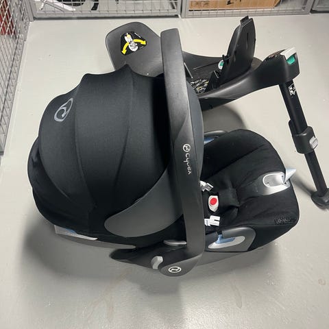 Cybex Cloud Z turvakaukalo, tarkoitettu noin 0–13 kg painaville vauvoille. Kuvissa näkyy harmaa verhoilu ja kantokahva, viisipistevaljaat sekä irrotettava vauvatuki.