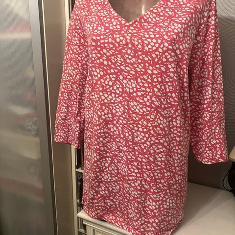 Nanso naisten paita koossa XXL. Väri punainen. Materiaali pääosin puuvillaa, mukana hieman elastaania joustavuuden lisäämiseksi. Paidassa on 3/4-hihat ja edessä halkio kaula-aukossa. Sopii arkipaidaksi tai rennoksi yläosaksi esimerkiksi housujen tai legginsien kanssa.postikulut ostajalle