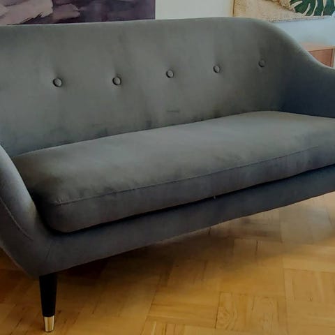 Vaaleanharmaa hyväkuntoinen sohva eteenpäin. Palvellut lähinnä teinin vaatesäilytyksenä. Vähän istuttu.