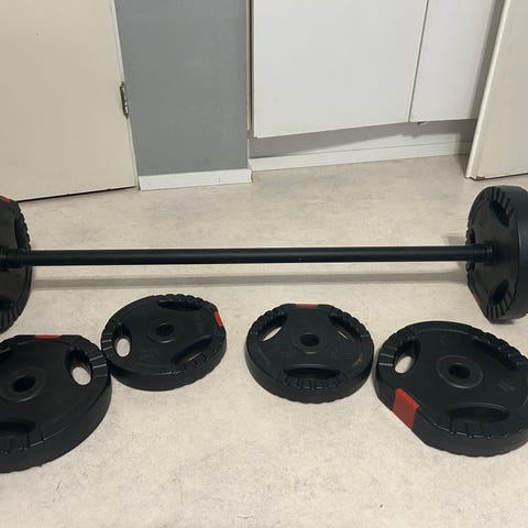 Säädettävä käsipainosetti ja levytanko kotiharjoitteluun. Settiin kuuluu levytanko ja kaksi lyhyempää käsipainotankoa, joihin voi kiinnittää useita irtopainoja. Painolevyt ovat monikulmaisia ja valmistettu muovipäällysteisestä materiaalista. Väri on musta punaisilla yksityiskohdilla. Sopii ylä- ja alavartalon lihaskuntoharjoitteluun kotona.