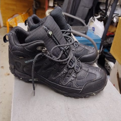 Merrellin siniset goretex vaelluskengät. Päällisin puolin siistissä kunnossa, viimeisissä kolmessa kuvissa näkyvät pienet virheet kengissä.