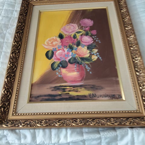 kukka-aiheinen taulu, jossa kaksi vaaleaa kukkaa tummalla taustalla. Teos on valmiiksi kehystetty mustalla kehyksellä ja siinä on kapea hopea sisäreunus. Sopii seinälle sisustuselementiksi esimerkiksi olohuoneeseen, makuuhuoneeseen tai työtilaan. Taulun takana on valmistajan kilpi sekä ripustusta varten tarkoitettu rakenne.