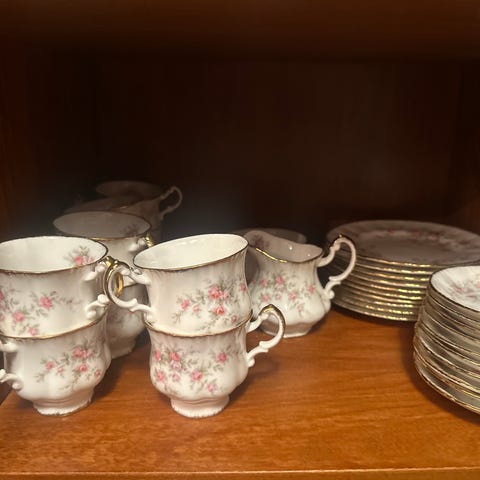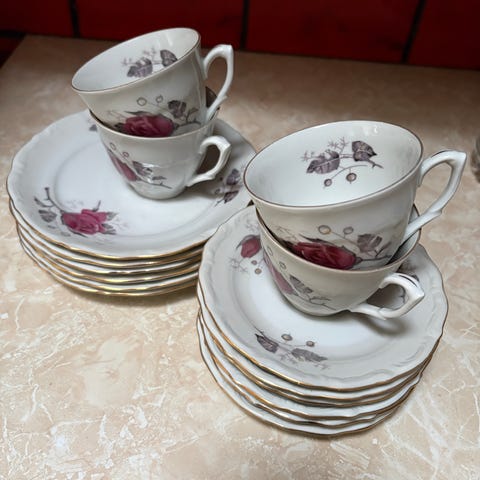 Kultareunaiset kahvikupit, asetit ja lautaset, 6kpl setti. Lisäksi sarjaan kuuluvat kermanekka ja sokerikko.