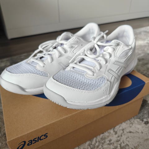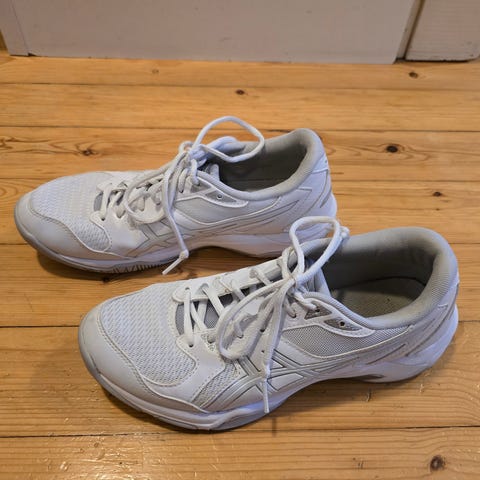 Asics Gel-Rocket sisäpelikengät. Kengissä on noin EU-koko 41 (valmistajan merkintä 40,5), ja ne sopivat sisäliikuntaan, kuten salibandyyn, lentopalloon tai muuhun halliliikuntaan. Väri on valkoinen mustilla yksityiskohdilla.