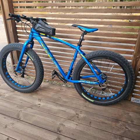Virheetön pyörä 4,00 x 26" renkain. Paremmat polkimet. Pulloteline, lampputeline ja lokarit. Geelipenkki paikoillaan ja kapean alkuperäisen saa myös mukaan.