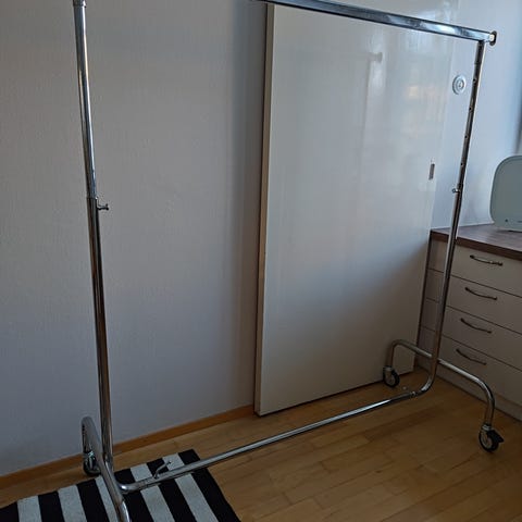 Jysk vaaterekki, alhaalla kenkätaso. Rekki on puuta. Sopii esim eteiseen, makuuhuoneeseen tai vaatehuoneeseen lisäsäilytystilaksi. Hyvässä kunnossa, jotain käytönjälkeä on henkareista tullut tohon ylös.