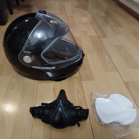 CKX Titan kelkkailukypärä kaksilla laseilla. Toisisss laseissa kirkaslinssi ja sähkölämmitys. Toiset lasit puolipeili linssillä ilman lämmitystä. Uutta vastaavat, pari lyhyttä reissua käyty, mutta ei sovi allekirjoittaneen päähän.