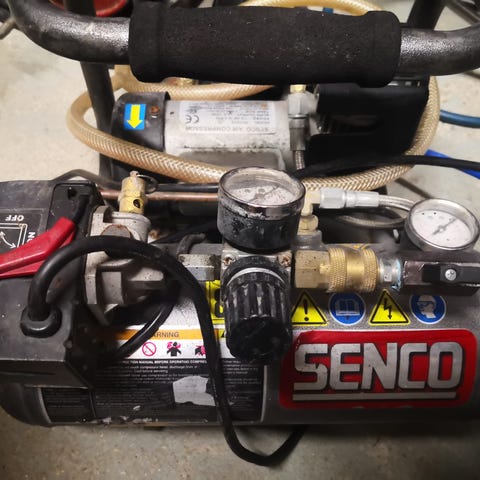 Andrew paineilmakompressori säiliöllä. Kokoonpanossa on paineilmasäiliö, paineensäädin, painemittari ja läpinäkyvä suodatin-/kuivainpatruuna.