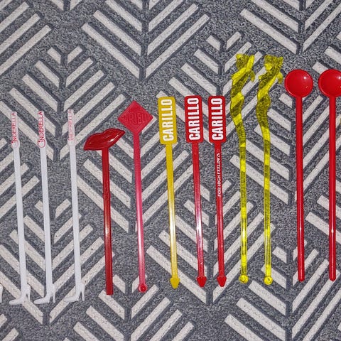 Retrot neon väreissä hohtavat miekkakalat, jotka on samalla drinkkitikut. Hauskat vaikkapa retrobileisiin!