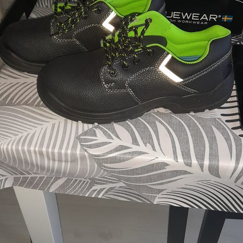 Työkengät, koko 42. Mustat, nilkkapituiset kengät, joissa oranssit yksityiskohdat ja paksu kuvioitu pohja. Soveltuvat työ- ja suojakengiksi erilaisiin olosuhteisiin.